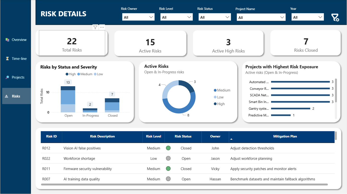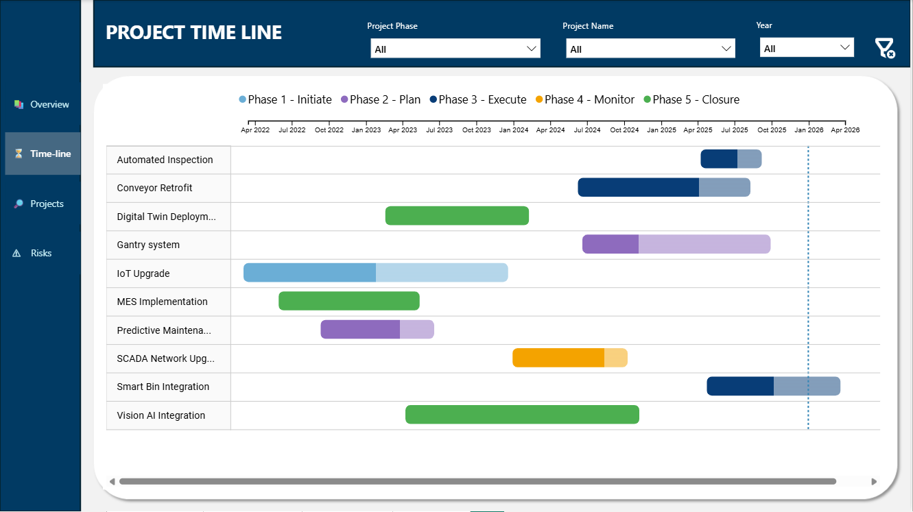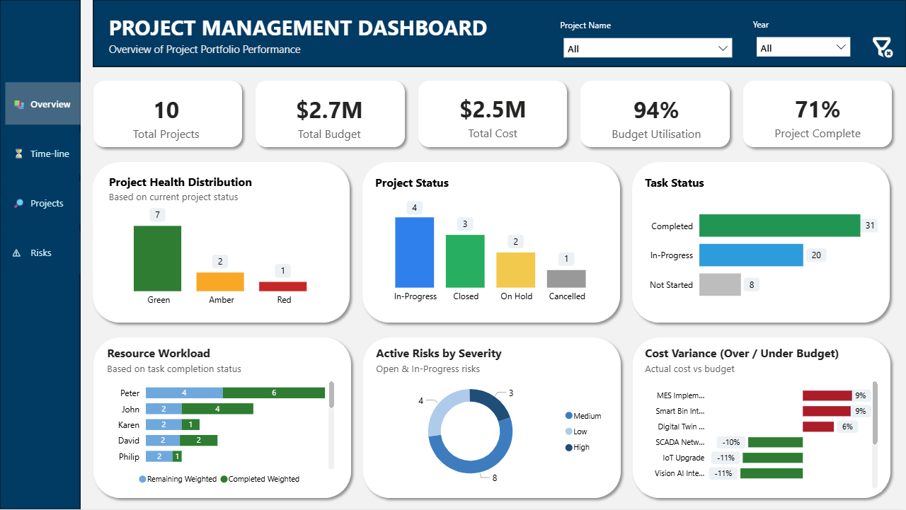 Track portfolio health, Gantt timelines, cost variance, workload distribution, and risks — all in one interactive executive-ready dashboard built for PMOs and project managers.